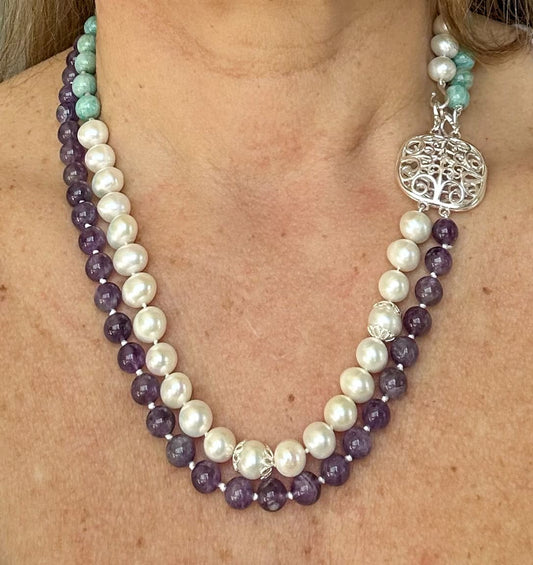 gran collar doble, Perlas, Calcedonias. Amatistas broche Plata.