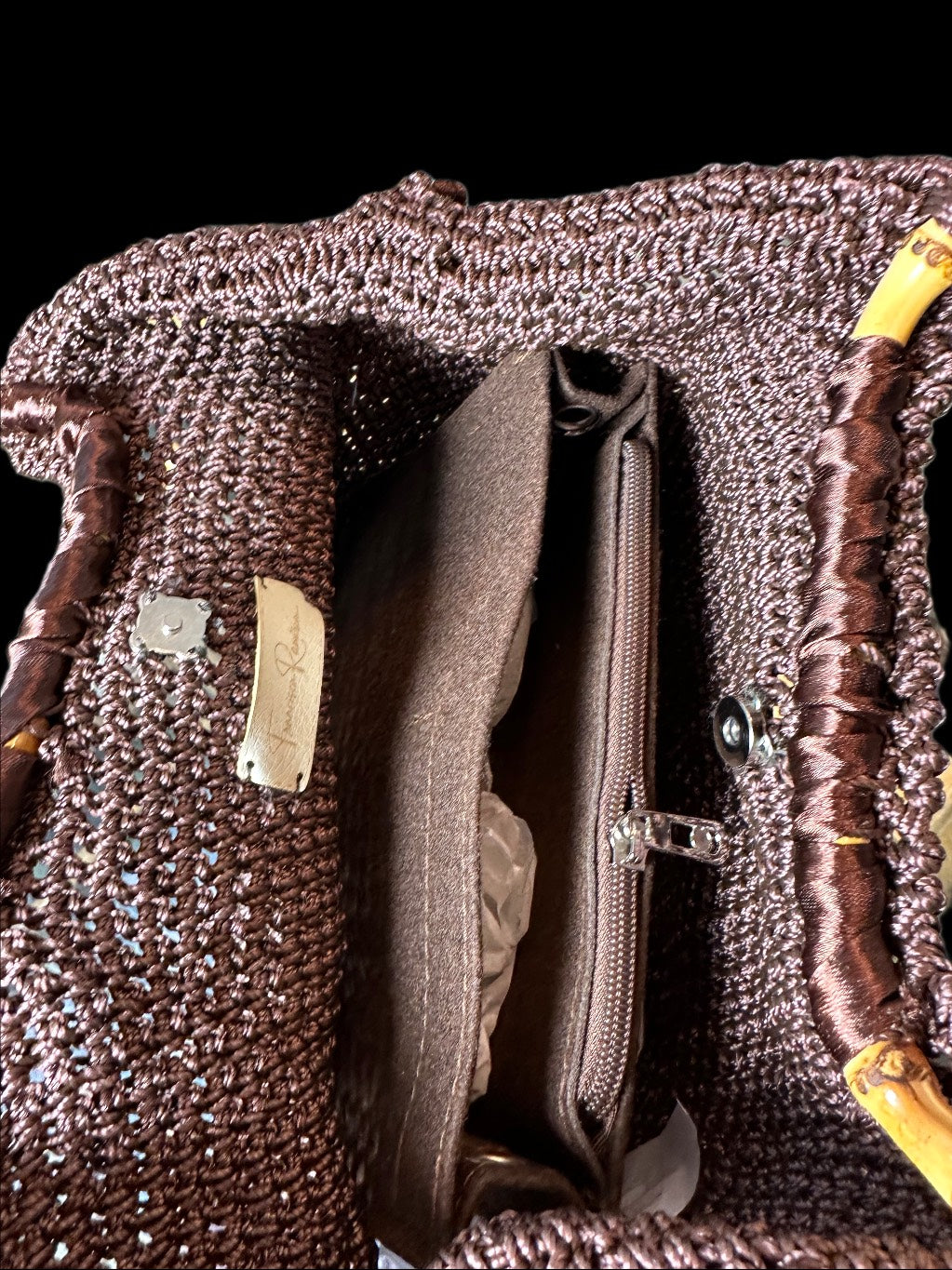 Maravilloso bolso seda viscosa, con organizador interno y broche, borlas de terminación.